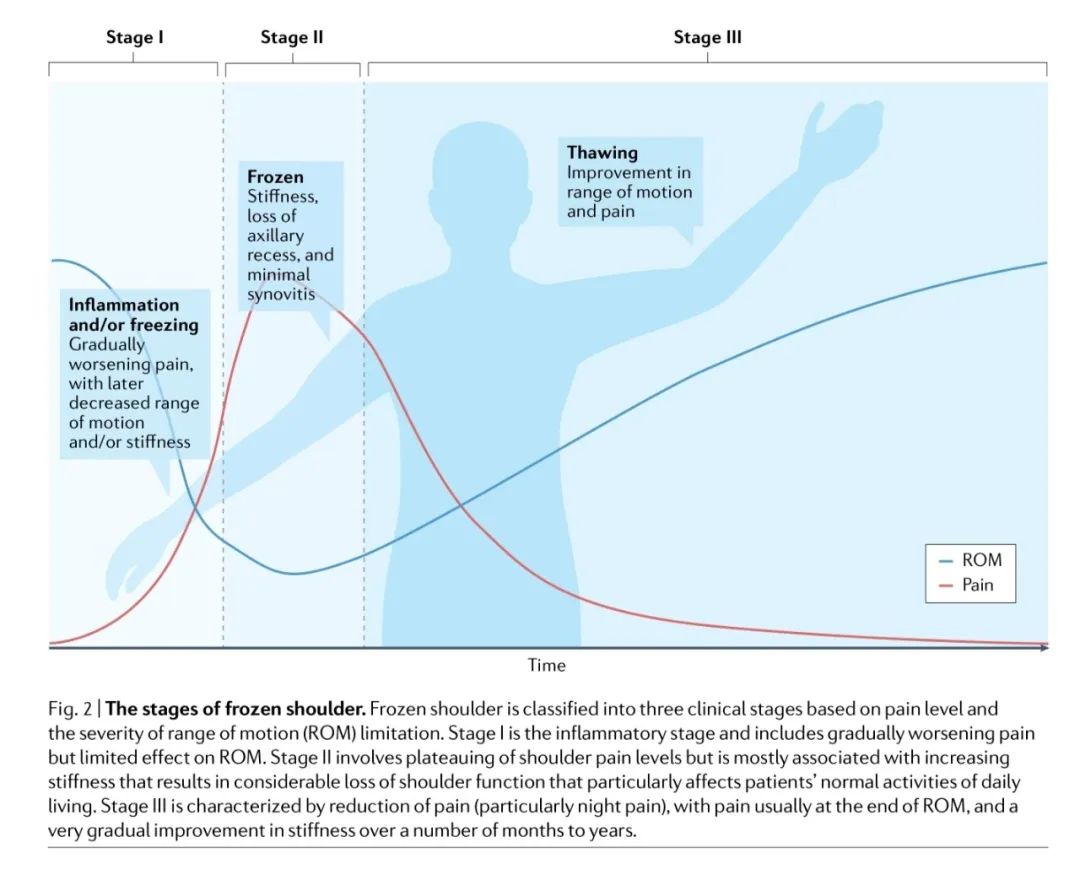 冻结肩影响着至少5%的人口,其发展分为3个阶段:冻结期、冰冻期和解冻期。
