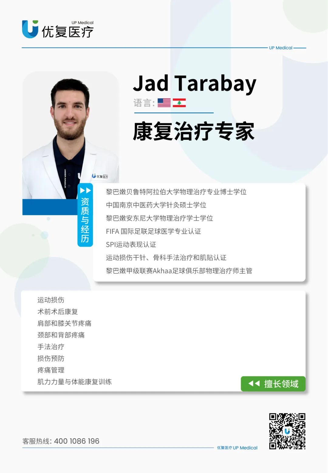 优复团队迎来新成员Jad Tarabay博士——他可能是最懂运动员焦虑的物理治疗师。Jad 拥有黎巴嫩物理治疗博士学位及学士学位,并在南京中医药大学获得针灸硕士学位。业余时间,他既通过篮球保持身体活力,也通过阅读保持思维敏锐——这使他更理解运动员伤后渴望重返赛场的心态。此外,Jad 热衷研发健康食谱,深谙营养在康复过程中的关键作用。