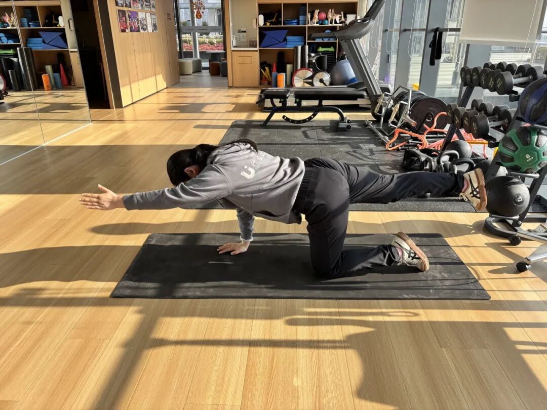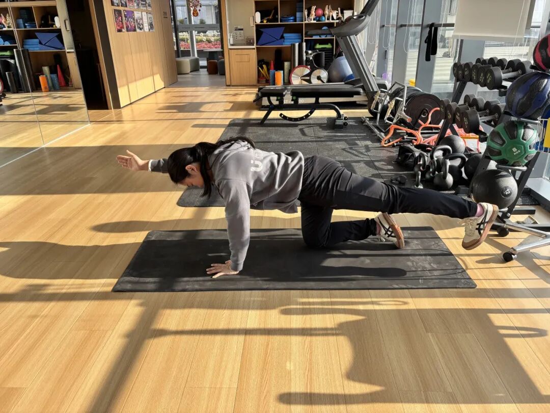 2. 收紧核心,缓慢伸展一侧手臂和对侧腿