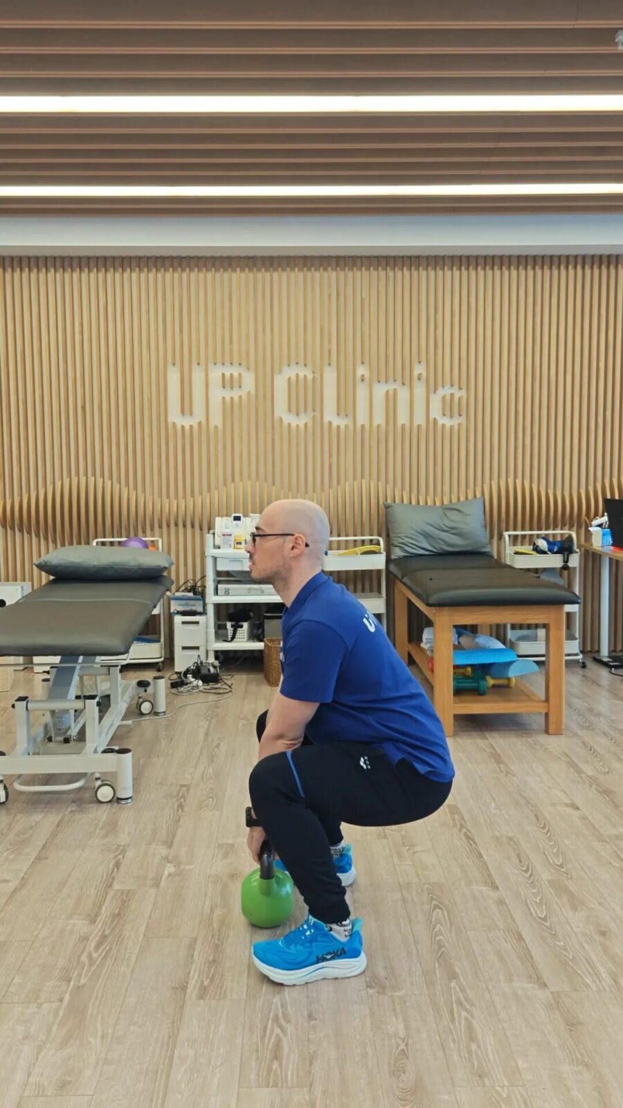 2. 屈膝下蹲,直到后膝盖接近地面