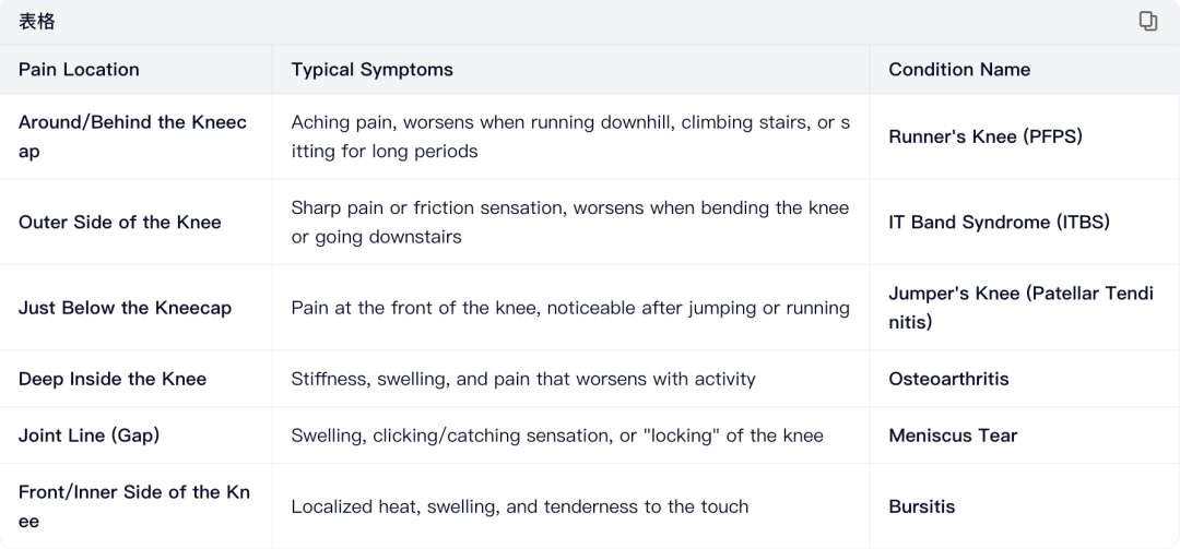 What does it feel like?: Aching pain around or behind the kneecap, especially when running downhill, climbing stairs, or sitting for long periods.